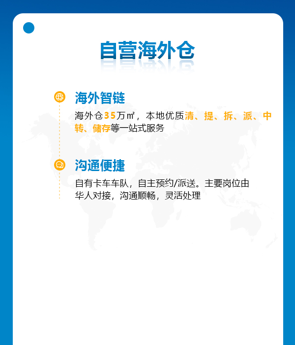 海外仓面积35万英尺,一站式物流,自有国外车队。
